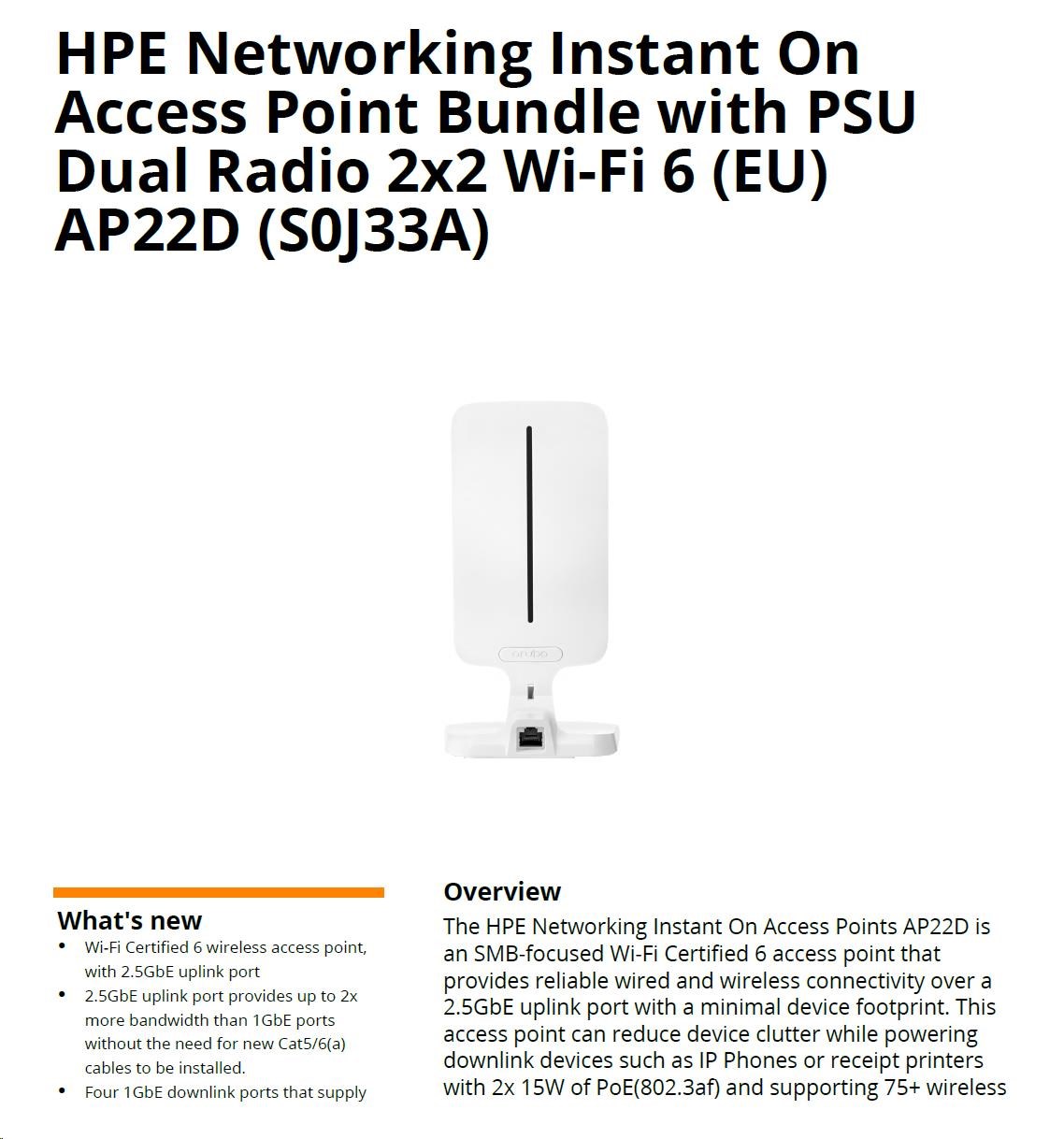 HPE Aruba Instant On Access Point AP22D Bundle with PSU Dual Radio 2x2 Wi-Fi 6 (EU) AP22D (desktop or wallmount)