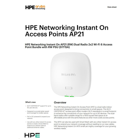 HPE Networking Instant On AP21 (RW) Dual Radio 2x2 Wi-Fi 6 Access Point Bundle with RW PSU.