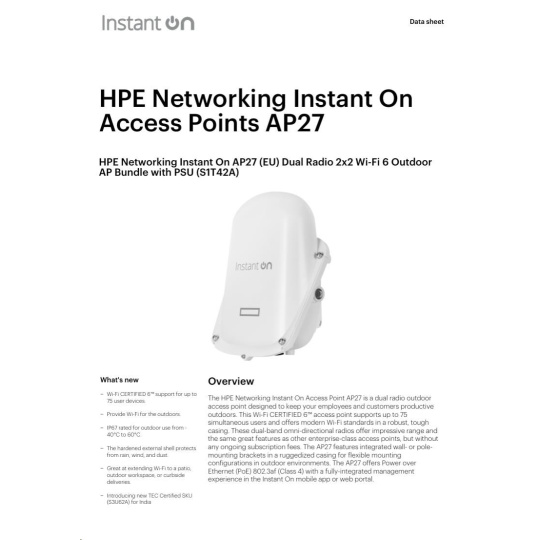 HPE Networking Instant On Access Point AP27 je dvoupásmový venkovní přístupový bod navržený tak, aby udržel vaše zaměstnance a zákazníky produktivní i venku. Tento přístupový bod s certifikací Wi-Fi CERTIFIED 6™ podporuje až 75 současně připojených uživatelů a nabízí moderní standardy Wi-Fi v robustním a odolném provedení. Tyto dvoupásmové všesměrové antény poskytují působivý dosah a stejné funkce jako jiné podnikové přístupové body, ale bez jakýchkoli průběžných poplatků za předplatné. AP27 je vybaven integrovanými držáky pro montáž na zeď nebo stožár v odolném krytu pro flexibilní instalace ve venkovních prostředích. AP27 nabízí napájení přes Ethernet (PoE) 802.3af (třída 4) s plně integrovanou správou prostřednictvím mobilní aplikace Instant On nebo webového portálu.