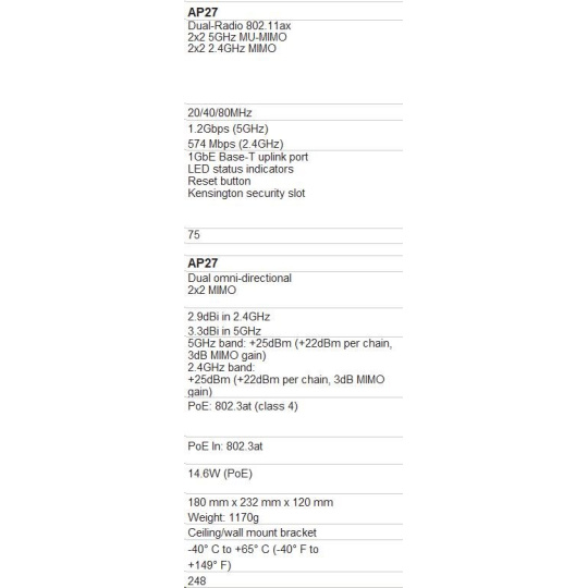 | Interfaces | 1 GbE BaseT Uplink DC Power Connector LED status Indicators Reset/LED control button Kensington security slot | 1 GbE BaseT Uplink DC Power Connector Bluetooth Low Energy (BLE) LED status Indicators Reset/LED control button Kensington security slott | 1x 2.5GbE BaseT PoE Class 4/6 Uplink 2x 1GbE BaseT PoE Class 3 Downlink 2x 1GbE BaseT Downlink DC Power Connector LED status Indicators Reset/LED control button Kensington security slot | 2.5GbE BaseT Uplink DC Power Connector LED status Indicators Reset/LED control button Kensington security slot | 1GbE Base-T uplink port LED status indicators Reset button Kensington security slot | 1x 2.5GbE BaseT Uplink DC Power Connector LED status Indicators Reset/LED control button Kensington security slot |