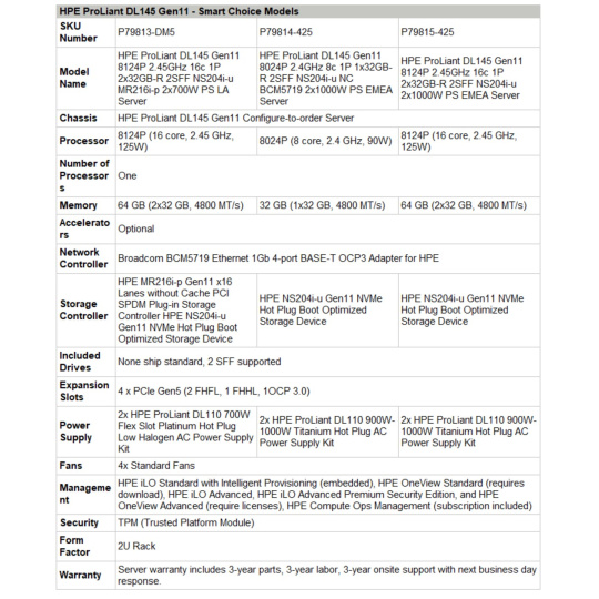 | Model Name | HPE ProLiant DL145 Gen11 8124P 2.45GHz 16c 1P 2x32GB-R 2SFF NS204i-u 2x1000W PS EMEA Server |