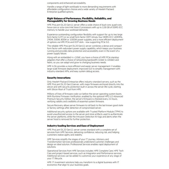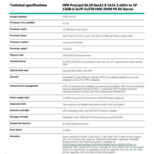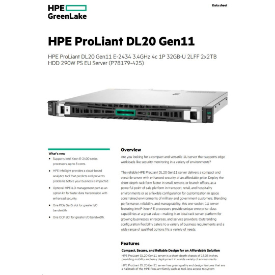HPE PL DL20g11 E-2434 (3.4G/4C) 1x32G (P64339) 2x2TB/7.2k SATA VROC 2LFF-HP 4x1Gb 290W Smart Choice