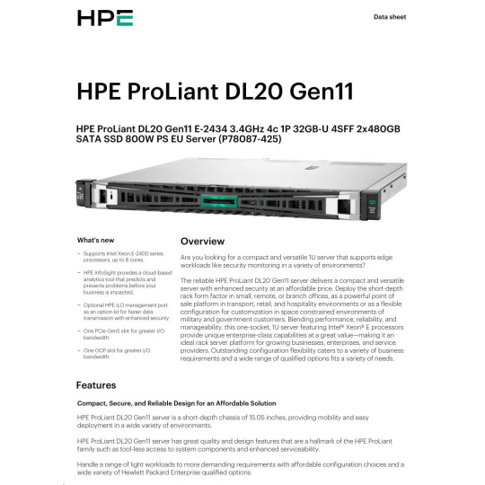 HPE PL DL20g11 E-2434 (3.4G/4C) 1x32G (P64339) 2x480G VROC 4SFF 1x800W 4x1G NBD333 Smart Choice.