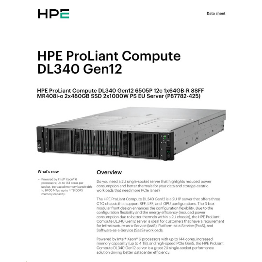 HPE PL DL320 Gen12 6505P (2.2/12C) 1x64G (P69728) 2x480G MR408i-o 8SFF 2x1000W 1GbE NBD333 Smart Choice.