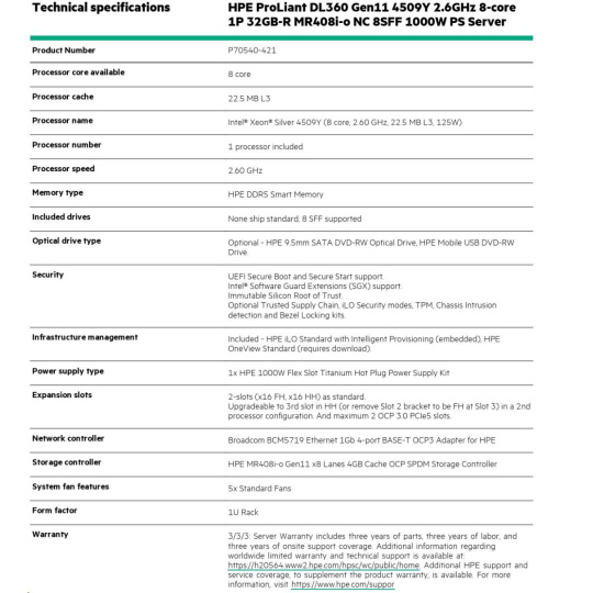 | Model Name | HPE ProLiant DL360 Gen11 4509Y 2.6GHz 8-core 1P 32GB-R MR408i-o NC 8SFF 1000W PS Server |