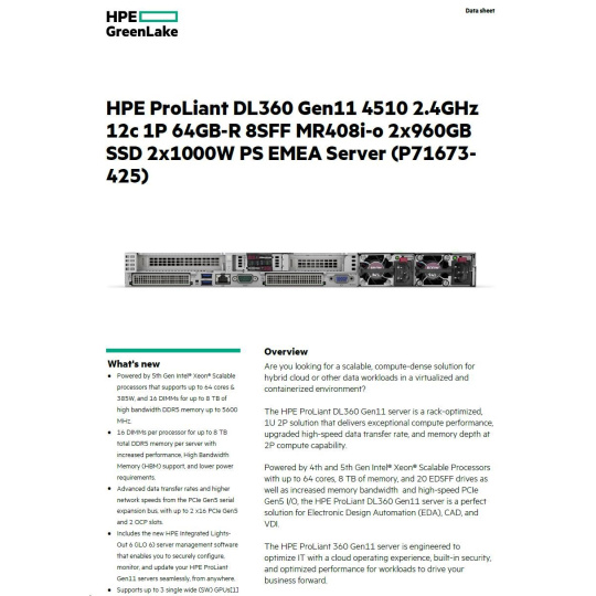 | Model Name | HPE ProLiant DL360 Gen11 4510 2.4GHz 12c 1P 64GB-R 8SFF MR408i-o 2x960GB SSD 2x1000W PS EMEA Server |