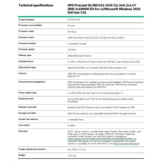 HPE PL DL380g11 4510 (2.4/12C) 2x32G (p64706) 2x2.4TB/10k MR416i-o/8G 2x1000W 8SFF 4x1G WS2025STD Smart Choice