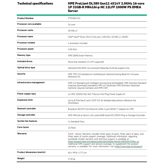 HPE PL DL380g11 4514Y (2.0/16C) 32G (p64706) MR416i-p/8G 12LFF 1000W 2x10G-T NBD333 2U