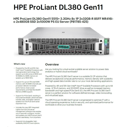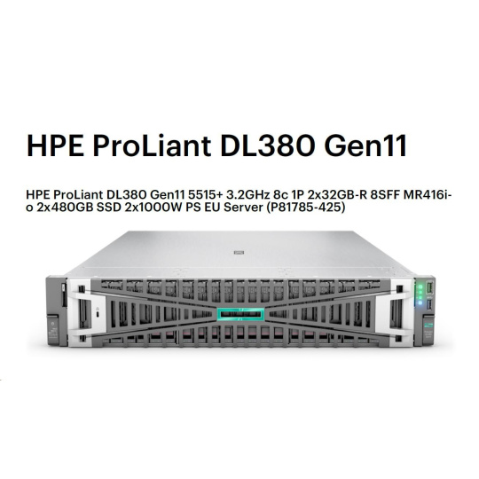 HPE PL DL380g11 5515+ (3.2/8C) 2x32G (p64706) MR416i-o/4G 2x480G 2x1000W 2x10G-T Smart Choice