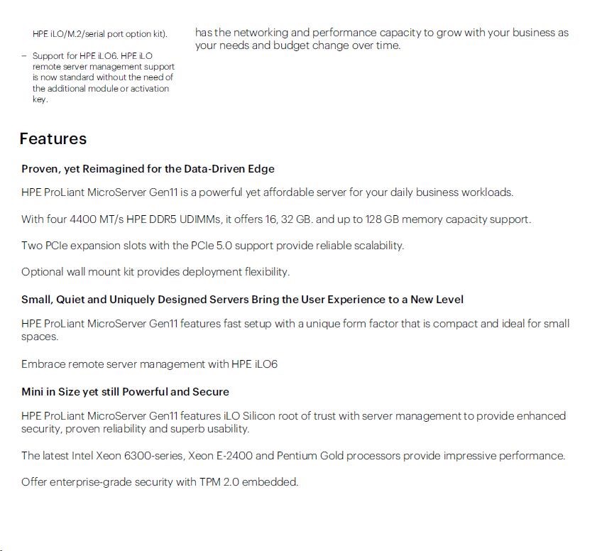 P74439-425: HPE ProLiant MicroServer Gen11 G7400 2c 16GB-U 4LFF-NHP 1TB HDD 180W Ext PS EMEA Cmp Module Server