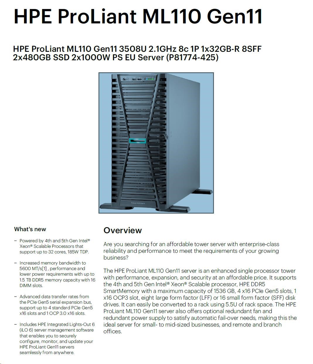 Model Name | HPE ProLiant ML110 Gen11 3508U 2.1GHz 8c 1P 1x32GB-R 8SFF 2x480GB SSD 2x1000W PS EU Server |