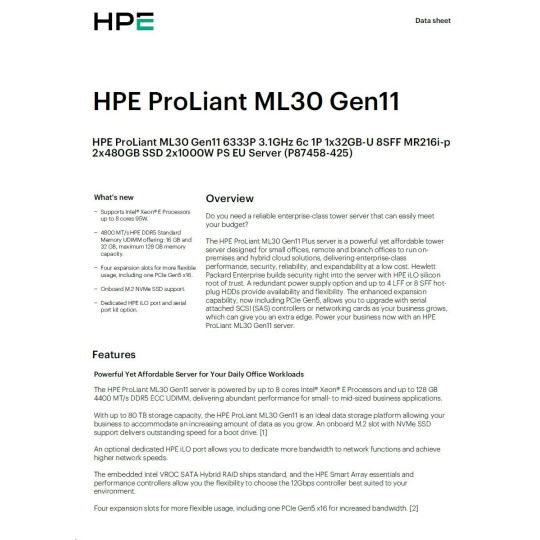 HPE PL ML30g11 6333P (3.1G/6C12T) 1x32G 2x480G 2x1000W MR216i-p 8SFF 4p1G NBD311 Smart Choice.