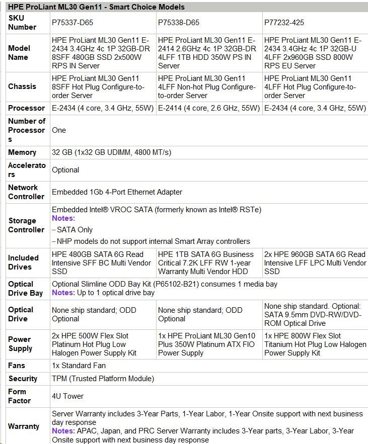 | HPE ProLiant ML30 Gen11 - Smart Choice Models | |
