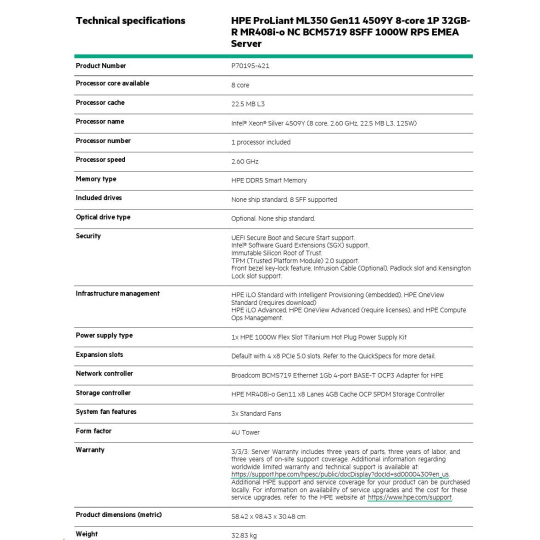 P70195-421: HPE ProLiant ML350 Gen11 4509Y 8-core 1P 32GB-R MR408i-o NC BCM5719 8SFF 1000W RPS EMEA Server