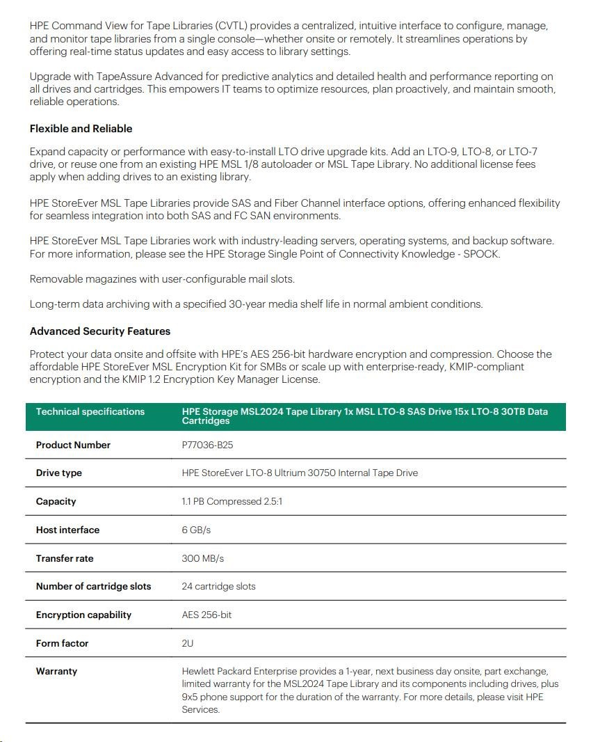 HPE Storage MSL2024 TapeLibrary (AK379A+LTO8S ASDriveQ6Q68A+15xQ2078A LTO8 30TBDataCartridges+Q2015ABarCodeLabelPack) SC