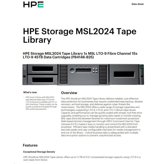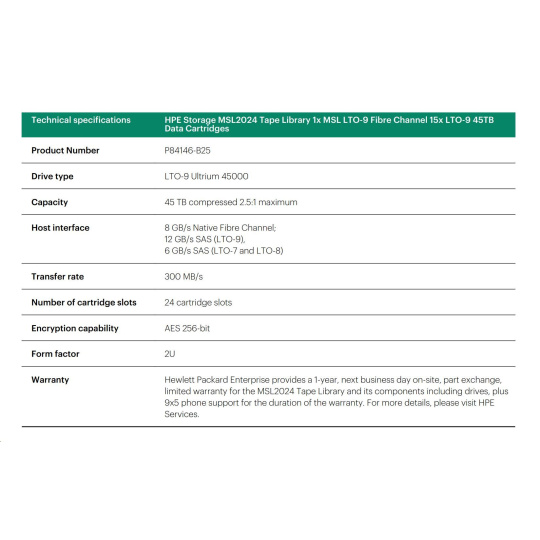 HPE Storage MSL2024 Tape Library 1x MSL LTO-9 Fibre Channel 15x LTO-9 45TB Data Cartridges.