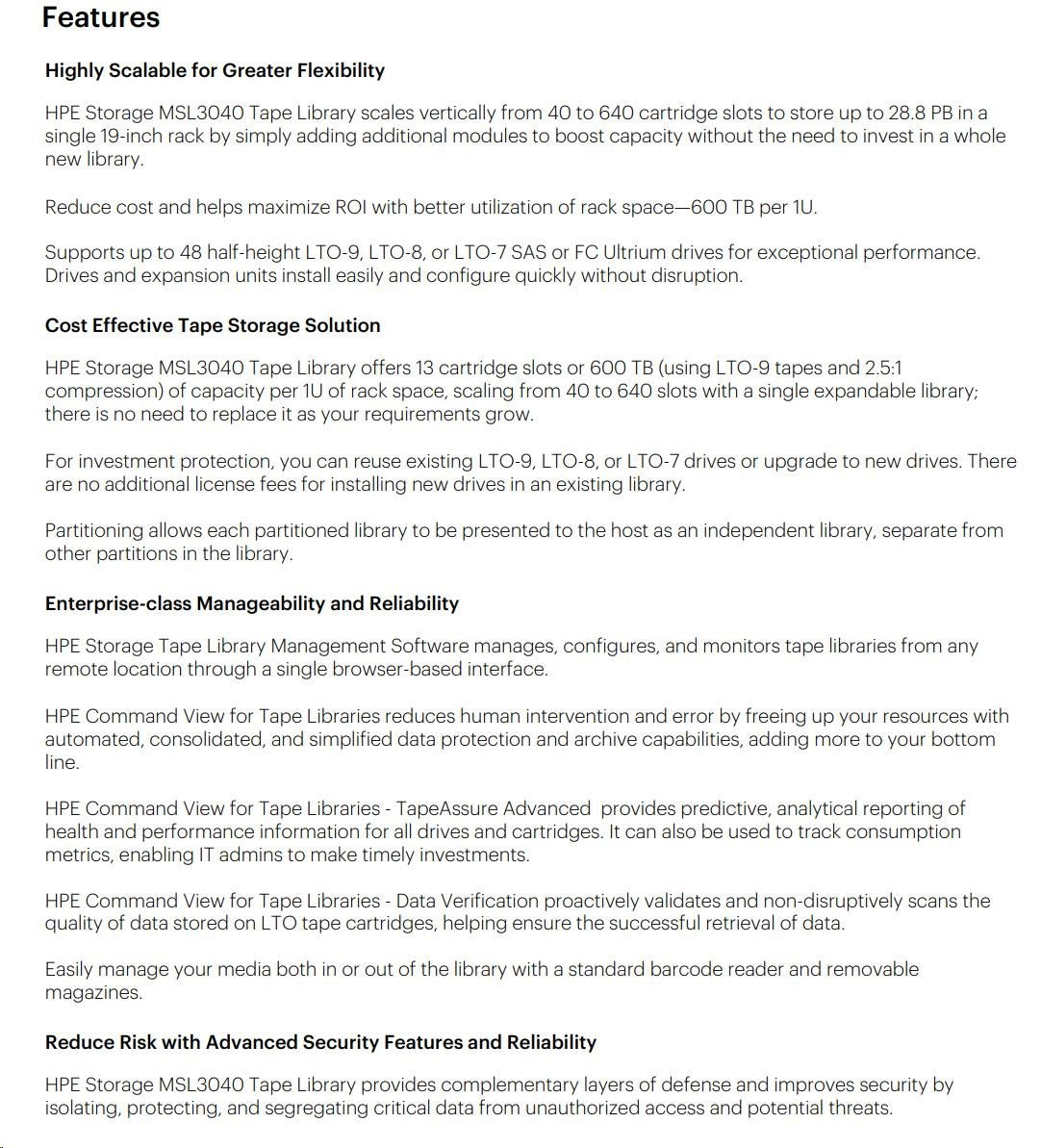 | Key Features - Exceptional storage density: 1.08 PB (2.5:1 compression using LTO-9 tape cartridges). - Easy-to-use web-based remote management for multiple libraries with HPE Command View for Tape Libraries (CVTL). - Integrated bar code reader. - Tool-free tape drive upgrades. - Leverage tape drives in an MSL2024 into an MSL3040 or 6480 for investment protection. - Removable magazines with user-configurable mail slots. - Extensive OS and software compatibility testing. - Achieve the highest level of encryption security to secure confidential business information while meeting compliance guidelines with the HPE MSL Encryption Kit or KMIP 1.2 Encryption Key Manager License. - Proactively monitor utilization, operational performance, and overall life and health of the drives and media with TapeAssure Advanced, a licensed feature of CVTL. |