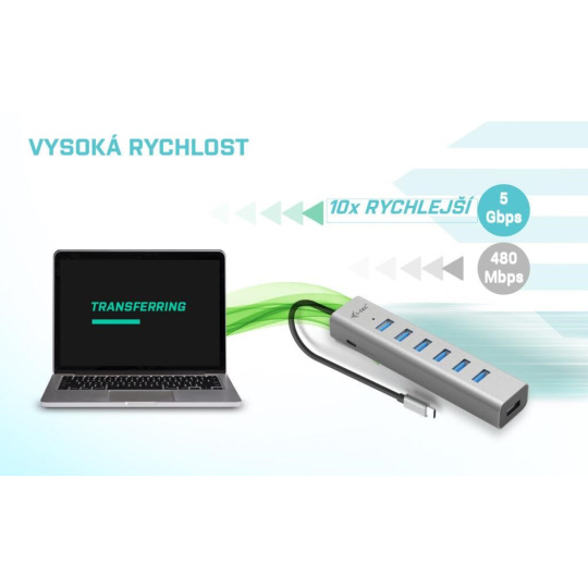 S tímto hubem získáte dalších 7 USB 3.0 portů (až 5 Gbps). Připojte si externí klávesnici a myš, přenášejte data nebo filmy z USB flash disku rychlostí až 5 Gbps nebo nabíjejte svá mobilní zařízení nabíjejte, až rychlostí 7.5W.