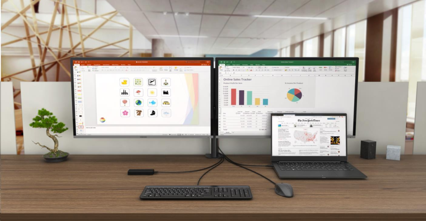 Kancelářská dokovací stanice USB-C, která podporuje až 2x externí monitor v rozlišení 4K. Stanice je kompatibilní s jakýmkoliv notebookem vybaveným portem USB-C nebo Thunderbolt 3. 6x USB port, spolehlivé a rychlé připojení do podnikové sítě díky integrovanému LAN portu, napájení až 100 W a podpora instalace za monitor, to vše z této dokovací stanice dělá ideálního společníka pro profesionály.