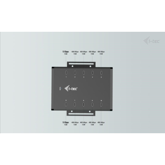 - 10x USB-C port, všechny podporují 15 W nabíjení