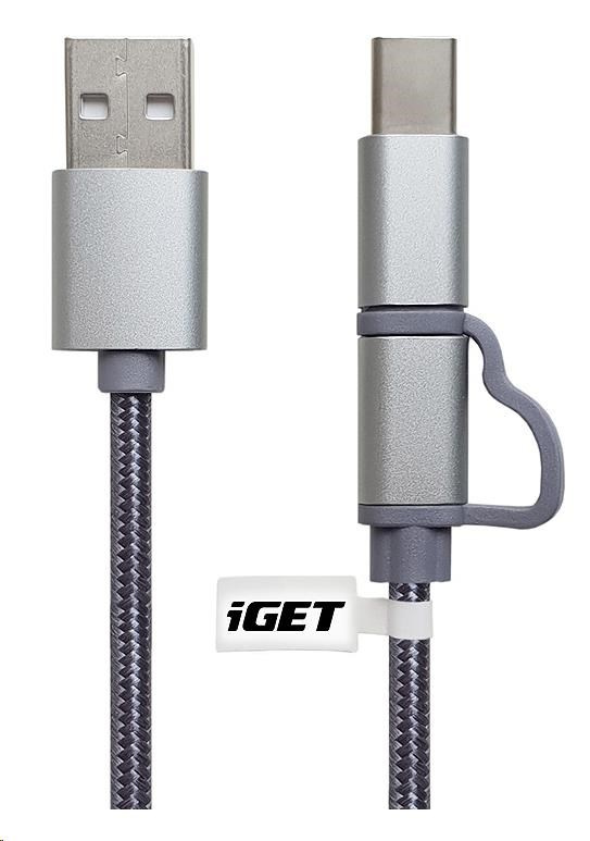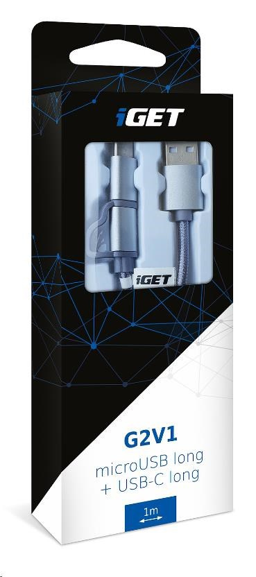 iGET G2V1 USB kabel 2v1, 1m, stříbrný, microUSB i USB-C, prodloužené koncovky