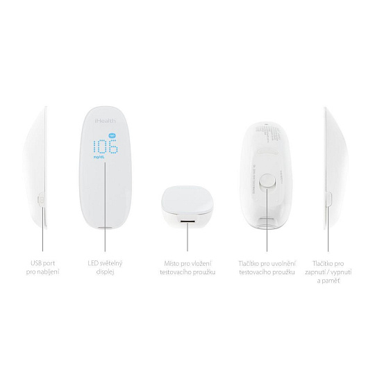iHealth GLUCO+ BG5S systém k monitorování glykémie Odběrové pero USB kabel pro nabíjení Cestovní pouzdro Uživatelský manuál
