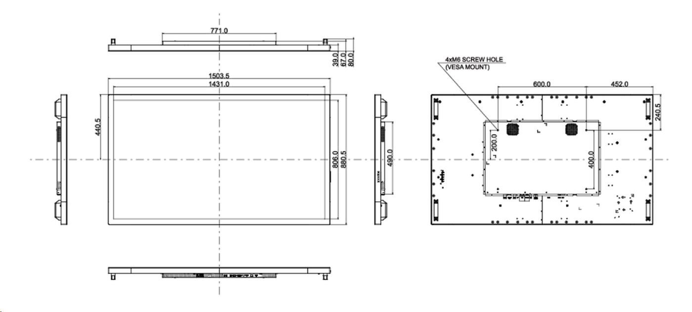 touch monitor (open-frame, 16:9), 165 cm (65''), Touchscreen, Projected Capacitive, resolution: 3840x2160 pixels, VESA mount, 8ms, brightness: 500cd, viewing angle: 178/178°(H/V), contrast: 1100:1, audio, VGA, display-port, HDMI, touch interface: USB, IP54, incl.: cable (USB, HDMI, Display Port), power supply unit, pow... více
