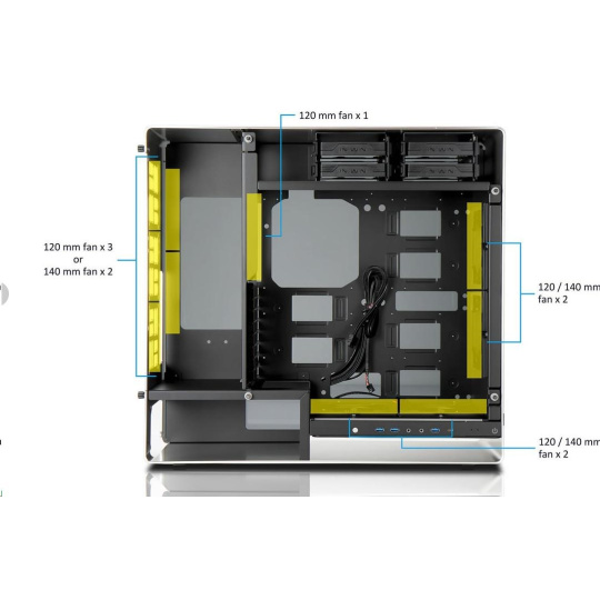Oddělené pozice HDD a PSU zajišťují ideální proudění vzduchu skrz skříň ven zadními větracími otvory, aniž by se odvod teplého vzduchu brzdil o základní desky nebo grafické karty.
