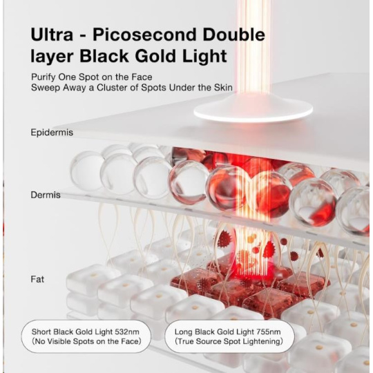 - Režim WHITEN (Bělení skvrn): Cíleně se zaměřuje na tmavé pigmentové skvrny, pihy a stopy po akné. Energie je pohlcena nahromaděným melaninem, který se teplem rozloží na menší částečky a tělo je následně přirozeně odbourá. Skvrny tak postupně blednou a stávají se méně viditelnými.