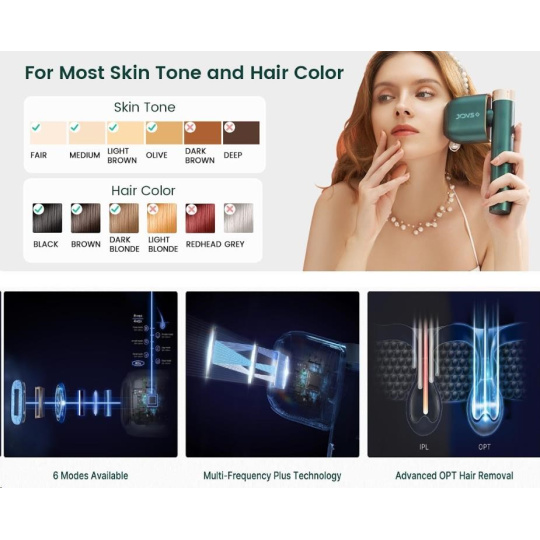 *Toto zařízení může používat kdokoli s typem pleti I až V na Fitzpatrickově stupnici. Pokud máte velmi tmavý odstín pleti (typ VI), toto zařízení prosím nepoužívejte. JOVS Pro II lze použít k ošetření tmavých blond až černých typů chloupků, ale nelze jej použít k ošetření světlých blond, zrzavých nebo šedivých chloupků.