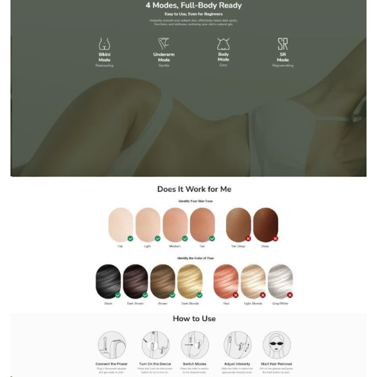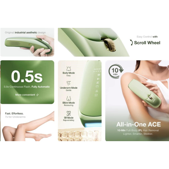 - Cílená péče pro celé tělo: Několik režimů a úrovní intenzity pro bezpečné ošetření nohou, rukou, podpaží, oblasti bikin i obličeje.