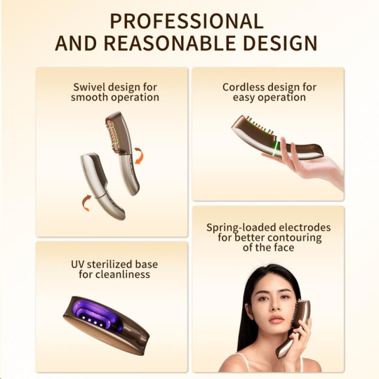 • Prémiový design a hygiena: Otočná hlavice , pružinové elektrody a bezdrátové provedení s UV dezinfekční základnou.