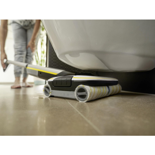 ** Čistič podlah Kärcher zkracuje dobu čištění až o 50 %, protože běžné nečistoty z domácnosti lze odstranit z tvrdých podlah v jediném kroku, aniž by bylo nutné před vytíráním vysávat.