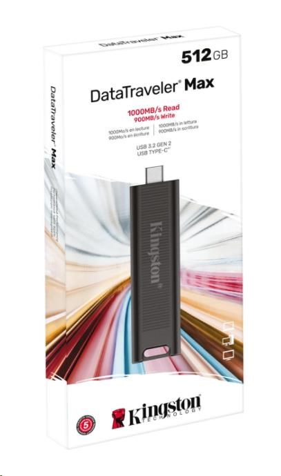 DataTraveler® Max značky Kingston je vysoce výkonný flash disk USB Type-C®1, který využívá nejnovější standard rozhraní USB 3.2 2. generace pro rekordní rychlost čtení/zápisu až 1000/900 MB/s2. Jedinečné pouzdro s prolisem, navržené s ohledem na přenosnost a pohodlí, chrání konektor, když ho nepoužíváte, a lze ho snadno přesunout jediným pohybem. DT Max nabízí špičkový výkon a rozšířené kapacity až 1 TB3, což z něj činí ideální řešení pro přenos a ukládání velkých digitálních souborů, jako jsou fotografie v rozlišení HD, videa v rozlišení 4K/8K, hudba a další.