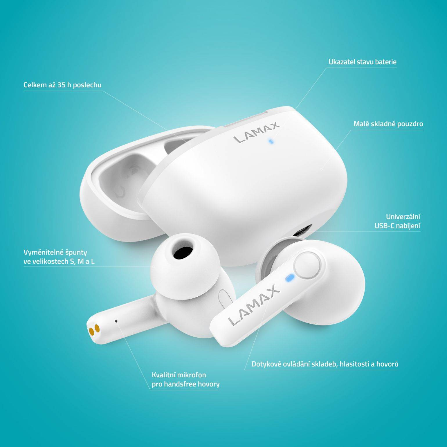 Kompaktní sluchátka s nožičkou skvěle sedí v uchu i ve skladným dobíjecím pouzdru, který se vejde do každý kapsy.