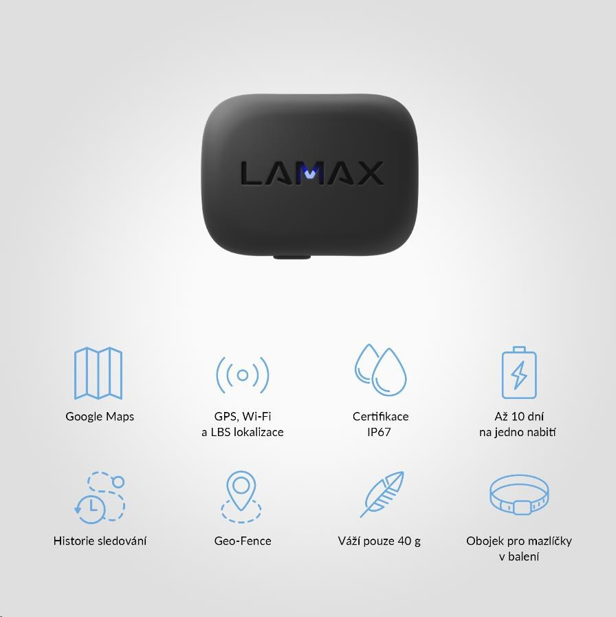 GPS Locator s výdrží baterie až 10 dní, ideální pro hlídání domácích zvířat, potomků, seniorů i movitých věcí, vodotěsnost IP67, hlasové funkce, SOS tlačítko, miniaturní rozměry, váha 40 gramů, aplikace LAMAX Tracking se spoustou chytrých funkcí, záznam trasy.... více