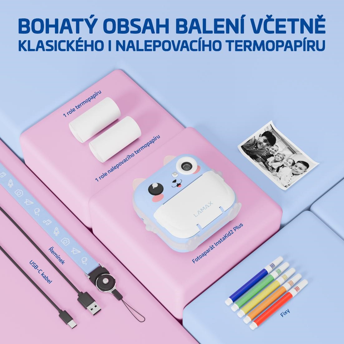 Objevte kouzlo zachycených momentů, které si vaše děti vytisknou během pár vteřin. Dětský fotoaparát LAMAX InstaKid2 Plus s okamžitým tiskem není jen roztomilý na pohled. S českou aplikací, vysokým rozlišením fotek i videa a sadou kreativních nástrojů se stává zábavným parťákem na výlety i do pokojíčku. Děti si s ním nejen vyfotí své zážitky, ale hned si je i vytisknou,vybarví přiloženými fixami a nalepí do deníku nebo kamkoliv budou chtít. Pomocí aplikace pak zvládnou tisknout fotky a poznámky z telefonu, skenovat texty ze sešitů, překlápět snímky do animovaného stylu nebo si s pomocí AI vybarvit černobílé obrázky. A když si od focení chtějí na chvíli odpočinout? O zábavu se postarají i vestavěné hry.LAMAX InstaKid2 Plus fotoaparát podporuje kreativitu, samostatnost i hravé učení a kdo ví, třeba právě tento foťáček odstartuje kariéru vašeho dítěte ve světe fotografií a filmu.