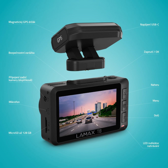 Autokamera LAMAX T8 s 2k rozlišením, detekce radarů, magnetický GPS držák, 2.4” displej, slot pro microSD až 128 GB, superkondenzátor, menu v češtině, Wi-Fi a mobilní aplikace, USB-C, 170° úhel záběru..... více