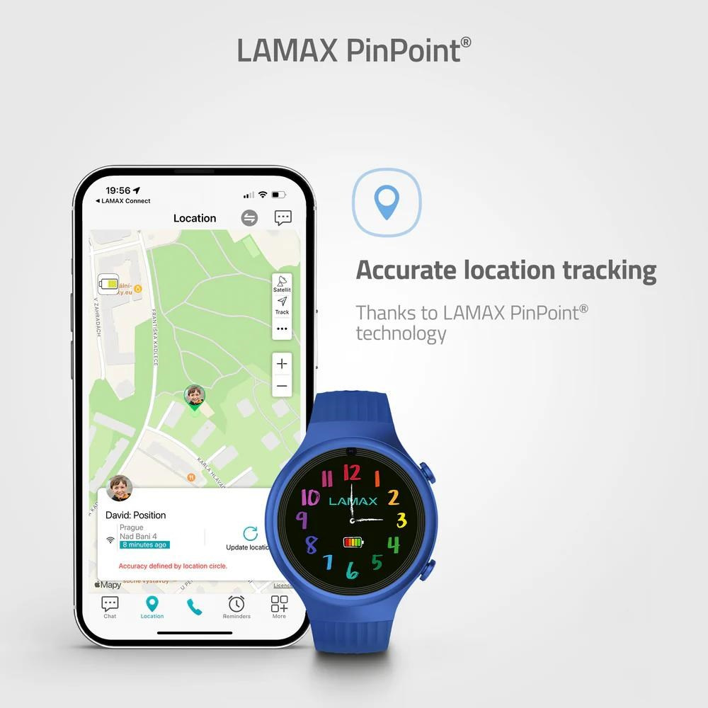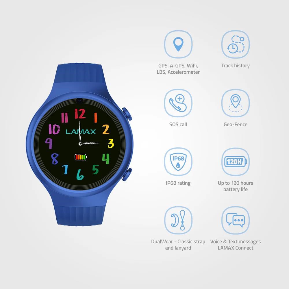 Dětské GPS hodinky, hlasové a textové zprávy, videohovory, určování polohy PinPoint®, bezpečnostní zóny, DualWear®, SOS tlačítko, funkce FriendsConnect® - propojení až 60 kamarádů, propojení všech členů rodiny díky FamilyCareConnect®, aplikace LAMAX Connect v češtině, šifrované spojení, výdrž až 120 hodin, krokoměr, připomínky, voděodolné, 1,2'' barevný dotykový displej s Gorilla Glass, SIM karta 200MB v balení