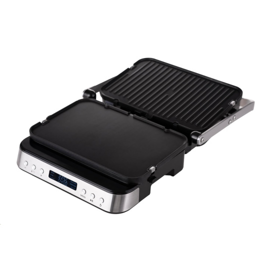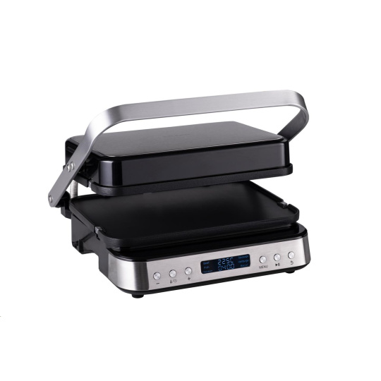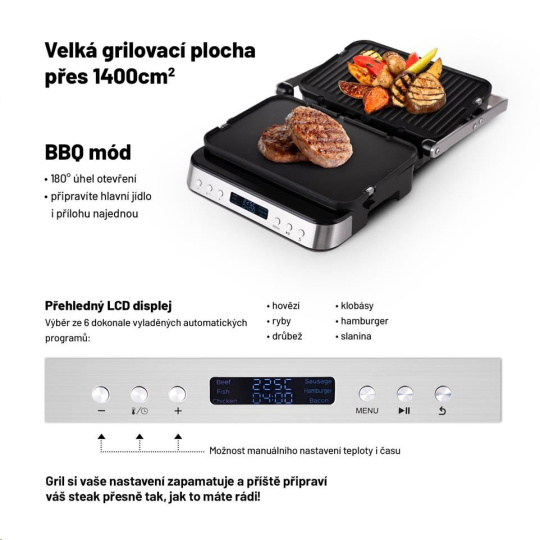 Kontaktní gril s příkonem 2000 W, 180° otevření, grilovací plocha 1400 cm2, 6 automatických programů, uživatelské nastavení a paměť, vyjímatelné plotýnky - v balení ploché a grilovací, vhodné do myčky, počet grilovacích ploch 2, odkapávací nádoba, regulace teploty a času, tepelná pojistka, nepřilnavý povrch, časovač, signalizace provozu, displej, zapékací poloha desek.... více
