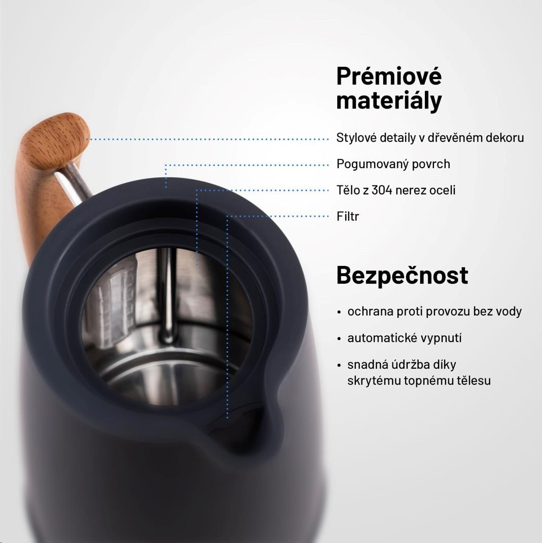 Rychlovarná konvice je jistě nepostradatelnou součástí každé kuchyně. Může být ale zároveň stylovým doplňkem, který pozvedne celý interiér na vyšší úroveň. Lauben Electric Kettle 17GR je designová rychlovarná konvice navržena v čistém severském stylu, z #304 nerezové oceli s prémiovým pogumovaným povrchem. Údržba konvice je snadná, topné těleso je skryto, tudíž se méně zanáší a konvice se lépe čistí. Mysleli jsme i na bezpečnost, konvice má pojistku proti přehřátí i vaření bez vody. Aktuální množství vody vždy poznáte z ukazatele na těle konvice. Díky svému designu konvice nejen dobře vypadá, ale je i praktická. Základna je otočná o 360° pro jednoduchou manipulaci a samozřejmostí je prostor pro skrytí kabelu, který jinak překáží a nevypadá hezky.