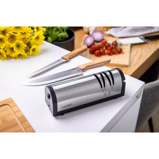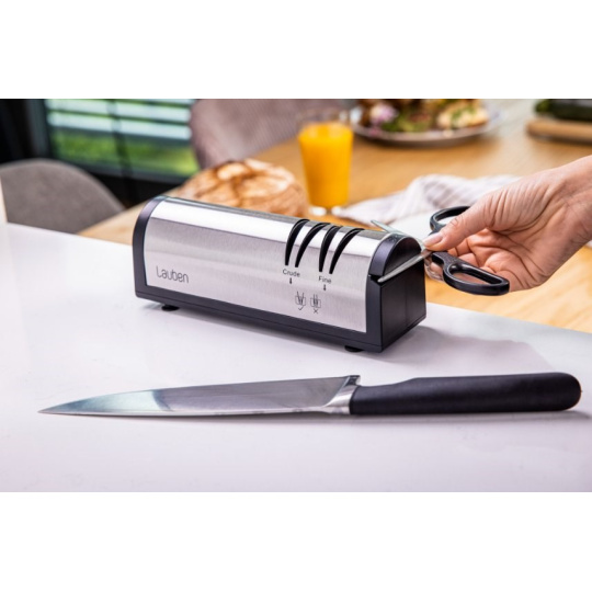 Díky Lauben Knife Sharpener 4700SB nabrousíte většinu nožů a sekáčků v pohodlí domova. Přidali jsme i speciální slot na broušení nůžek, i s těmi se tedy bruska Lauben poradí. Bruska umožňuje dva stupně broušení – hrubé a hladké začištění. Díky vodicím drážkám pro udržení správného sklonu a optimálnímu brusnému úhlu 15° zvládnete dokonale nabrousit každé ostří jako profesionál. Stačí brusku zapojit, spustit a vložit ostří, které chcete nabrousit.