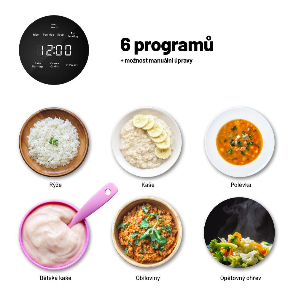 Přednastavené funkce (Rice, Porridge, Soup, Re-heat, Baby Porridge, Coarse Grains) zajistí automatickou přípravu rýže, kaší, polévek, obilovin nebo opětovné ohřátí jídla.