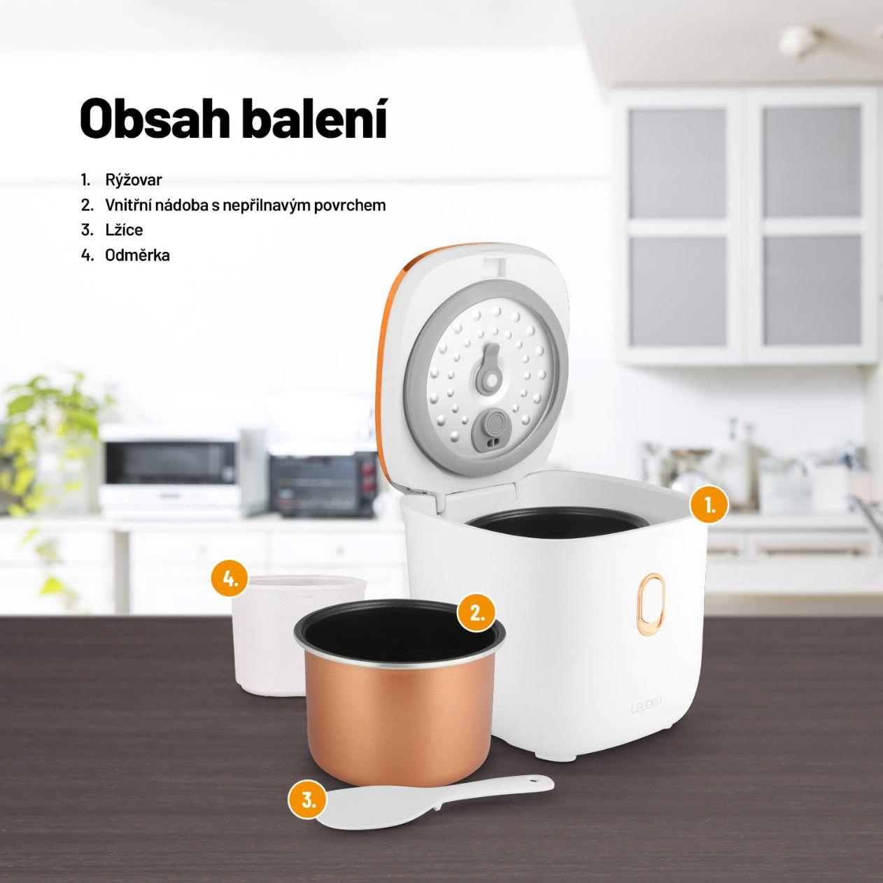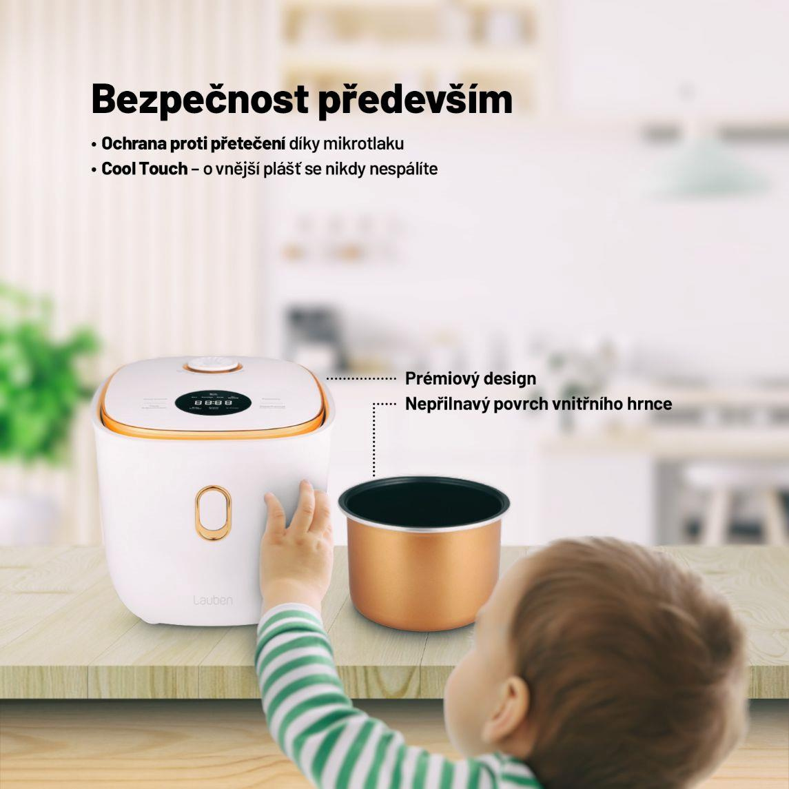 Efektivita, snadné použití a design mají společného jmenovatele, je jím víceúčelový rýžovar Lauben Multifunction Rice Cooker 1200WR Rose Gold Edition. Stiskem jediného tlačítka uvaří všechny druhy rýže na správnou tvrdost a 6 přednastavených funkcí vykouzlí další pokrmy jako kaše nebo polévky. Čas některých programů si však na intuitivním dotykovém displeji můžete nastavit i manuálně. Díky funkci odloženého startu lze mít jídlo připraveno už po návratu domů, opozdilci zase ocení funkci Keep Warm, která udrží pokrm teplý bez rozvaření. Porce nasytí jednotlivce i páry, jež pak mají více času pro sebe, protože ani údržba nezabere čas. Vnitřní hrnec lze dát do myčky. Bezpečné používání zajišťuje ochrana proti přetečení a technologie Cool Touch proti popálení. Rýžovar bude ozdobou každé kuchyně, kterou rozzáří trendy rose gold barvou, a přitom nezabere takřka žádné místo.