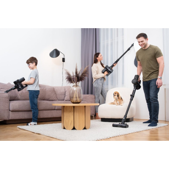 Univerzální motorizovaný kartáč se hodí pro všechny druhy podlah včetně těch, na nichž se pohybují domácí mazlíčci. Nejen jejich chlupy bezpečně odstraní hlavice se systémem proti namotávání vlasů. Úklid usnadňuje flexibilní tyč s kloubem a sběrná nádoba umístěná v horní části, vysavač tak jednoduše zajede i pod nábytek a do užších prostor. Díky provedení bez kabelu a možnosti úpravy na ruční vysavač lze přístroj využít kdekoliv, například při čištění auta. Vydrží až 35 minut na jedno nabití.