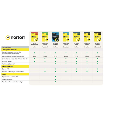 Norton 360 Standard poskytuje komplexní ochranu před malwarem pro jeden počítač PC, počítač Mac, zařízení se systémem Android nebo iOS a funkci zálohování do cloudu pro počítač PC, což pomáhá zabránit ztrátě dat kvůli ransomwaru nebo selhání pevného disku, a správce hesel pro ukládání a správu vašich hesel. Norton 360 Standard také obsahuje funkci ochrana sítě VPN, která vám umožňuje bezpečnější a anonymnější procházení webu, a to i ve veřejných sítích Wi-Fi a aplikaci ochrana kamery před zneužitím pro počítače PC.