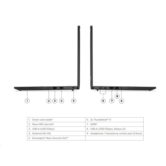 | Standartné porty | 1x USB-A (USB 5Gbps / USB 3.2 Gen 1) 1x USB-A (USB 5Gbps / USB 3.2 Gen 1), Always On 2x USB-C® (Thunderbolt™ 4 / USB4® 40Gbps), with USB PD 3.0 and DisplayPort™ 2.1 1x HDMI® 2.1, up to 4K/60Hz 1x Headphone / microphone combo jack (3.5mm) 1x Ethernet (RJ-45) 1x Smart Card Reader 1x Nano-SIM Card Slot |