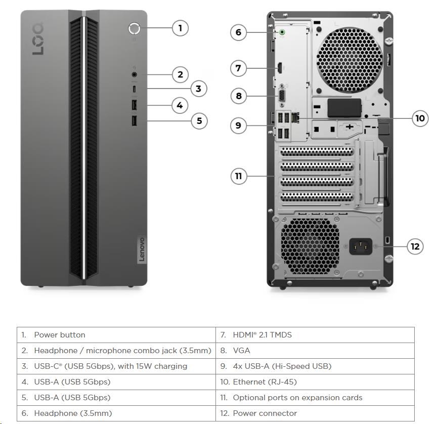 | Zadné porty | 4x USB-A (Hi-Speed USB / USB 2.0) 1x HDMI® 2.1 TMDS 1x VGA 1x Ethernet (RJ-45) 1x headphone (3.5mm) 1x power connector |