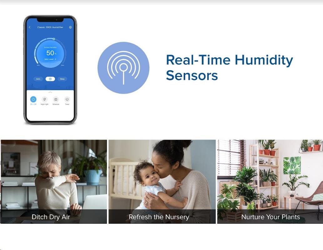 Zvlhčovač vzduchu Levoit Classic300S Smart lze ovládat přímo na přehledném podsvíceném LED displeji nebo také přes aplikaci na chytrých zařízeních Apple nebo Android. Nebo si ho můžete dokonce připojit do svého Smart Home a ovládat hlasem přes Google Assistant nebo Amazon Alexa. Senzor vlhkosti zobrazuje vlhkost v reálném čase a v automatickém režimu tak okamžitě reaguje na změny vlhkosti. Vždy by se mělo jednat o rozmezí mezi 40 % až 60 %. Přes aplikaci si můžete informace kontrolovat nebo si své režimy plánovat.
