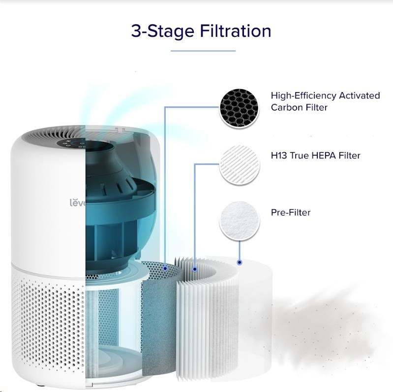 Druhou vrstvou je HEPA filtr H13. To odlišuje Levoit od konkurence, protože filtr HEPA H13 je mnohem kvalitnější a spolehlivější než běžně používané HEPA H11. Tu se odfiltrují jemné prachové částice, plíseň, bakterie, pyl, kouřové částice, roztoče a srst.